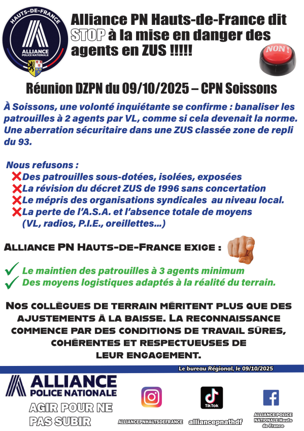 À Soissons, une volonté inquiétante se confirme : banaliser les patrouilles à 2 agents par VL, comme si cela devenait la norme. Une aberration sécuritaire dans une ZUS classée zone de repli du 93...